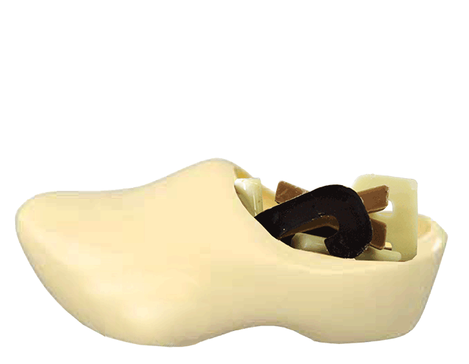 Chocolade klomp van ca. 250 gram chocolade en een lengte van ca. 17 cm. gevuld met minilettertjes of chocolademuntjes. Ook leverbaar in melk- of pure chocolade. Verpakt in foliezakje met strik. Minimum afname 100 stuks. Zie ook onze choco Sinterklaas.