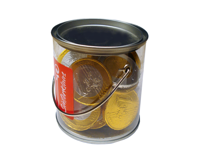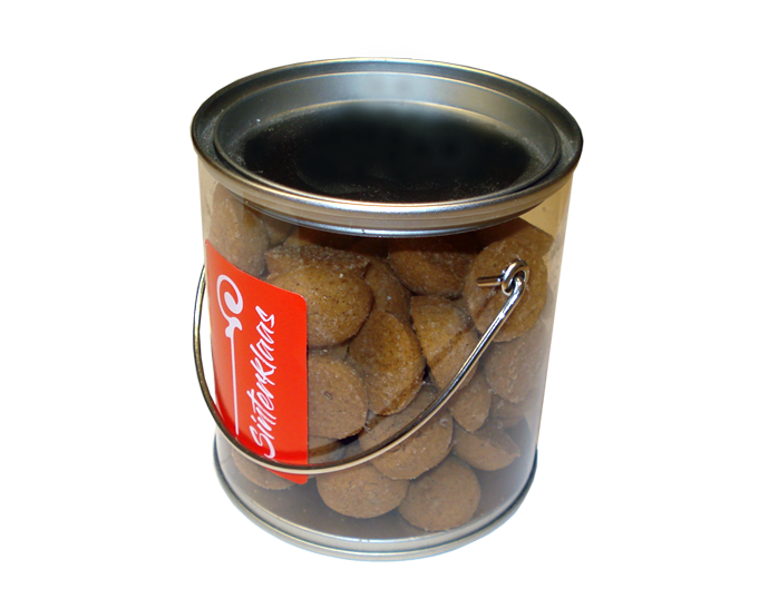 Transparant emmertje van pvc met metalen dekseltje gevuld met lekkere chocolademuntjes maar natuurlijk kunnen er tal van andere lekkernijen in.